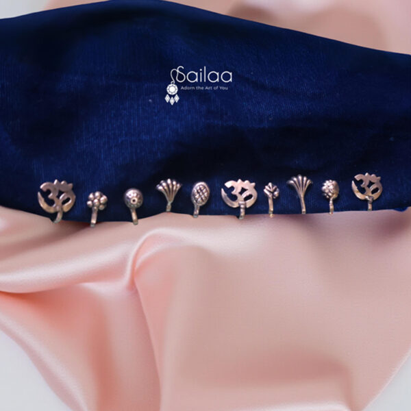Sailaa Pack of 10 Oxidized Nose Pins – Traditional Om, Floral & Designer Motifs for Women
