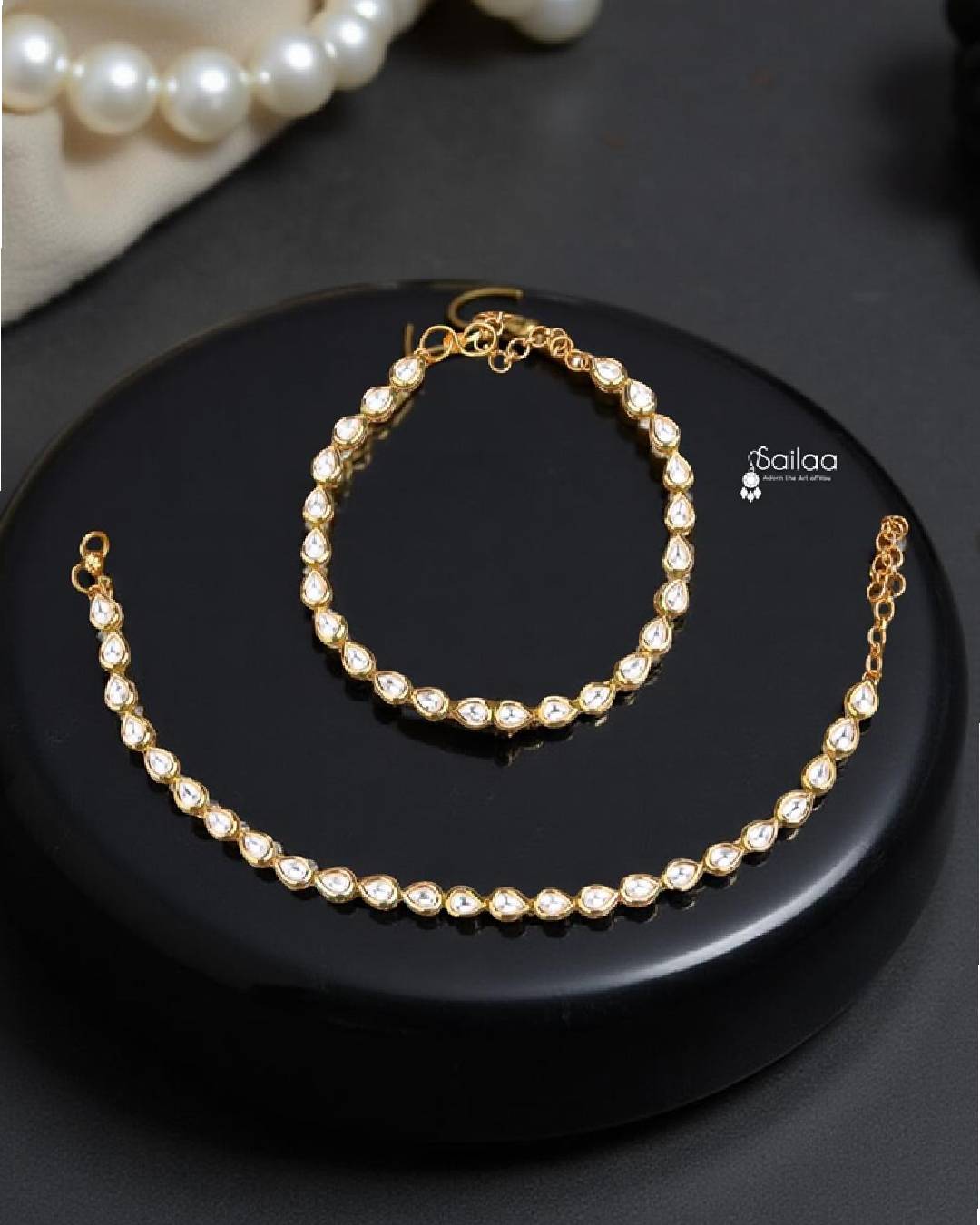 Adorn your ankles with timeless elegance. This exquisite gold-plated kundan payal from Sailaa is a perfect blend of traditional Indian craftsmanship and modern design. Each anklet features a delicate chain meticulously studded with sparkling, pear-shaped white kundan stones, capturing the essence of classic elegance.