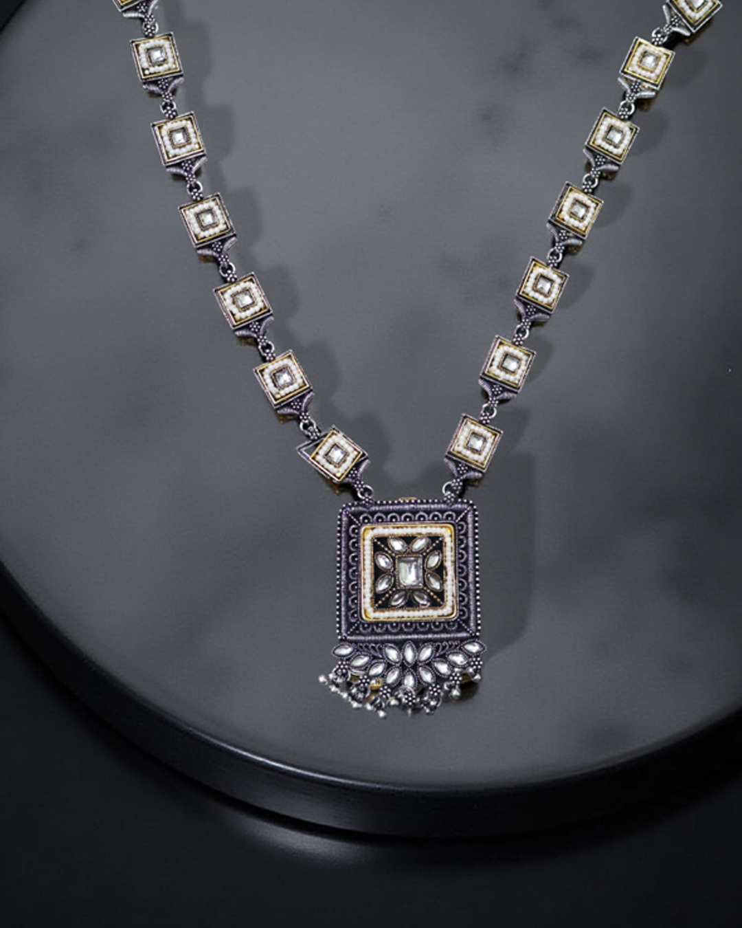 Enhance your ethnic charm with Sailaa’s elegant oxidised silver jewellery set, featuring a beautifully handcrafted square pendant necklace paired with matching jhumka earrings. Designed with intricate detailing, this set is perfect for sarees, kurtis, and festive occasions. Lightweight, stylish, and timeless – this oxidised jewellery adds a graceful touch to your traditional and modern outfits.