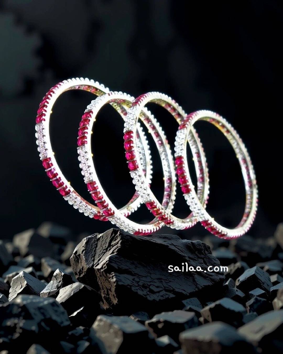 Elegant Ruby & CZ Stone Bangle Set – Silver Finish (Set of 4)