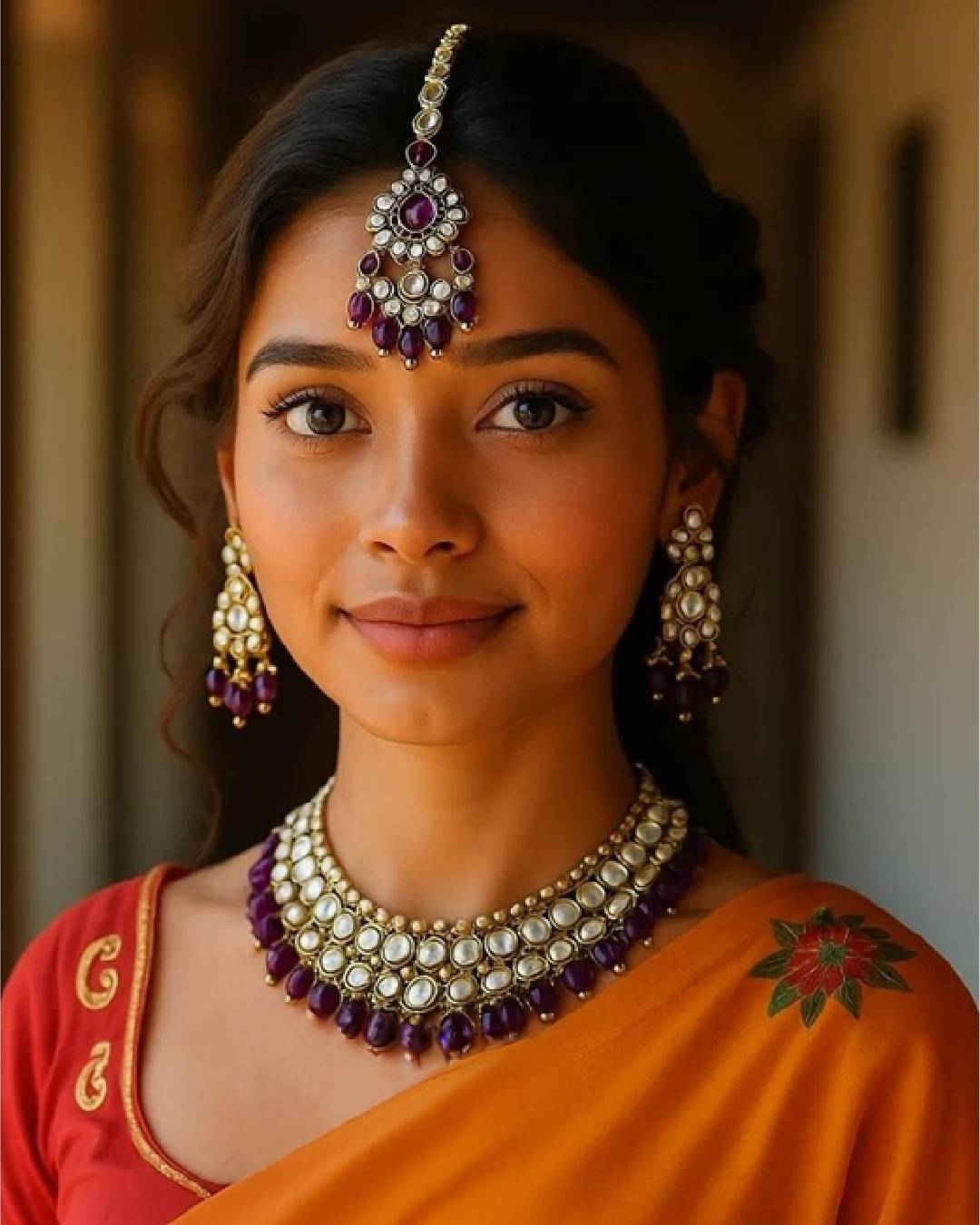Step into timeless elegance with the Sailaa Kundan Bridal Jewellery Set, a masterpiece of traditional craftsmanship and modern bridal glamour. This premium set features a grand choker necklace, statement earrings, and a matching maang tikka, adorned with shimmering kundan stones and wine beads. Perfectly designed for weddings, engagements, and festive occasions, this jewellery set adds a royal charm to your bridal look, making you shine effortlessly on your big day.