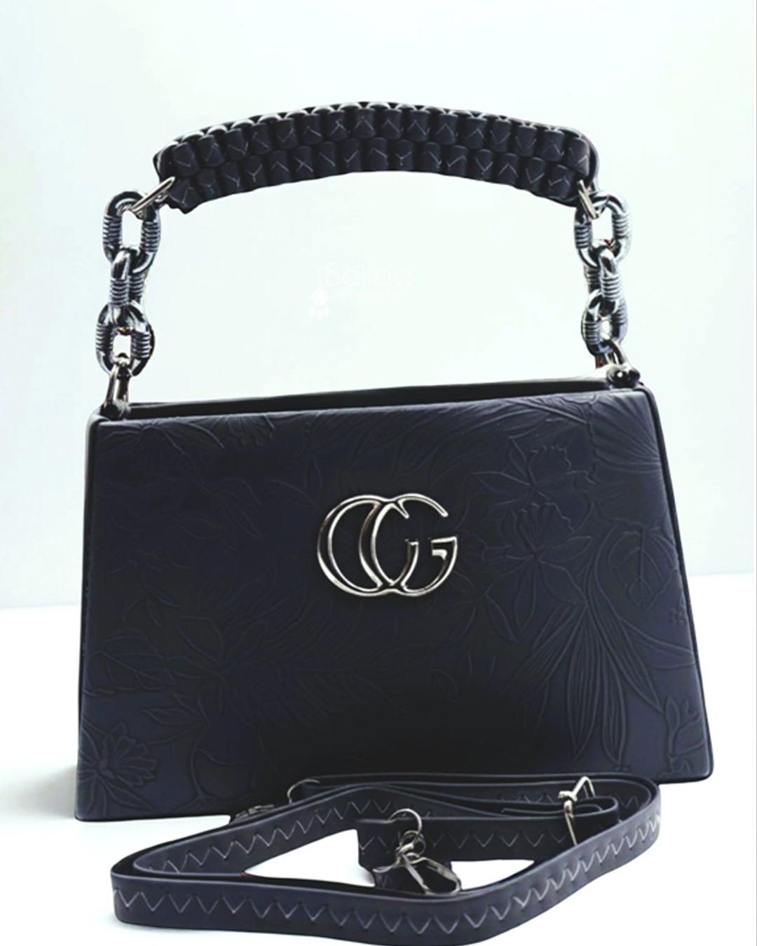 Elevate your style with this stunning black designer handbag, crafted from premium embossed leather with a delicate floral pattern. Featuring a bold silver GG logo, a braided leather top handle, and detachable crossbody strap, this luxury handbag combines sophistication and versatility. Perfect for both day and night, it offers a structured silhouette that adds elegance to any outfit.