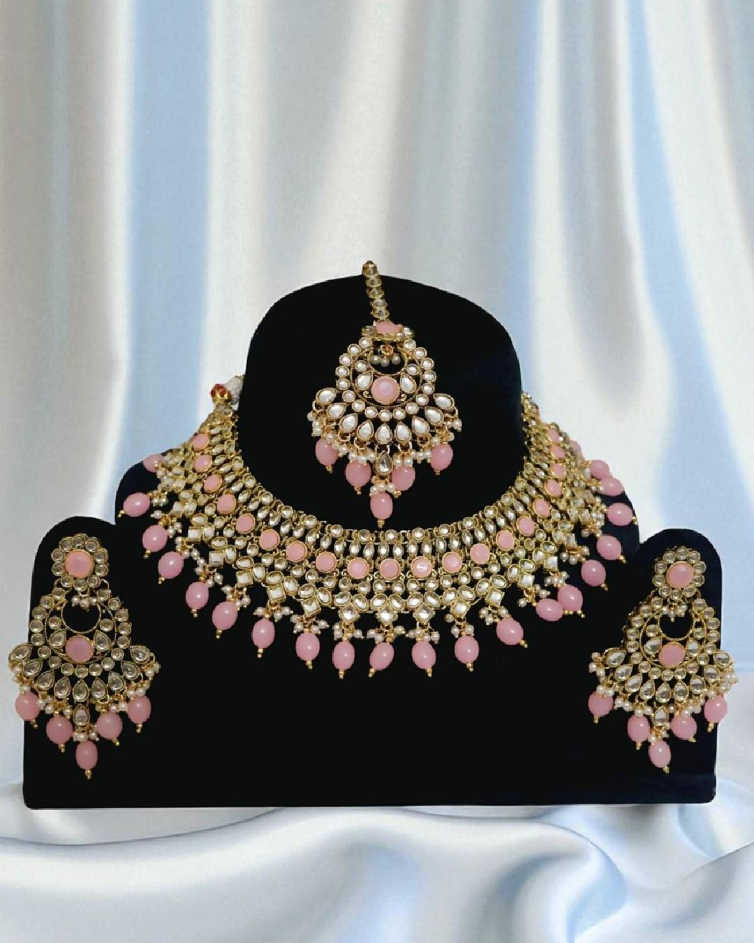 Sailaa Royal Kundan Bridal Jewellery Set with Pink Beads – Necklace, Earrings & Maang Tikka